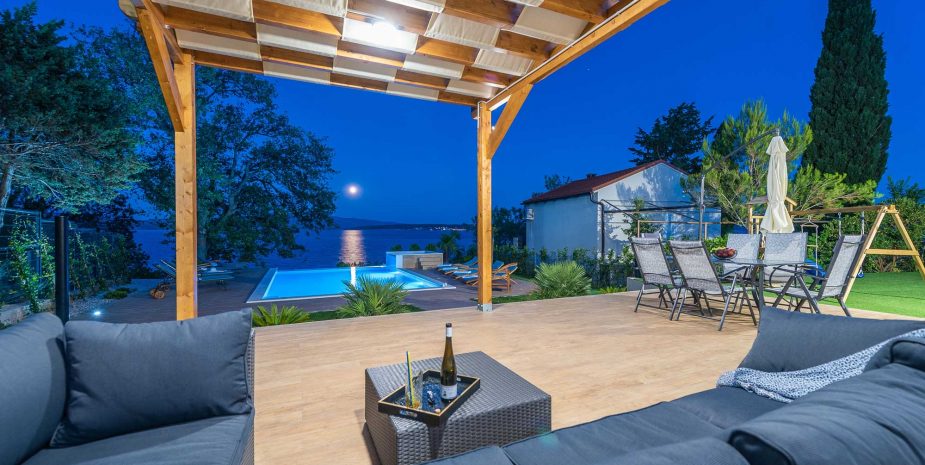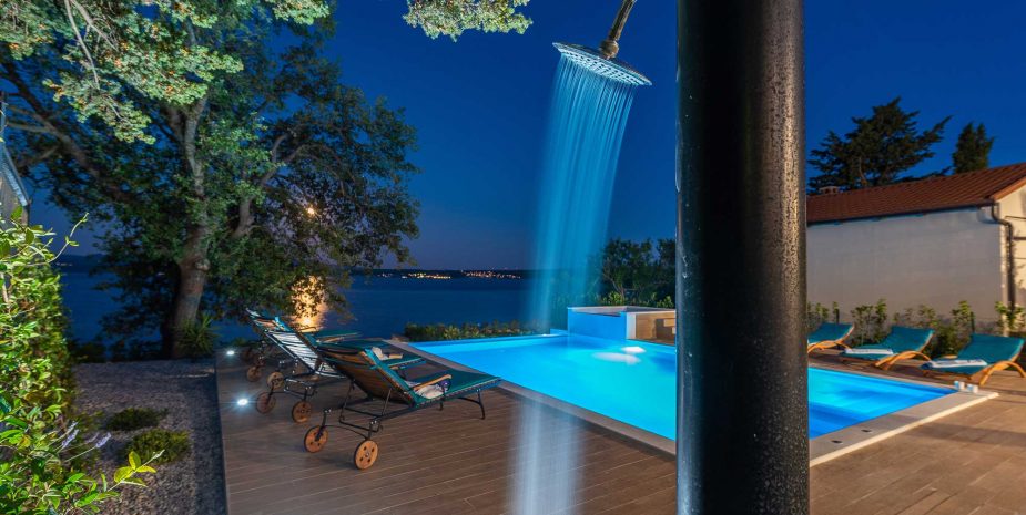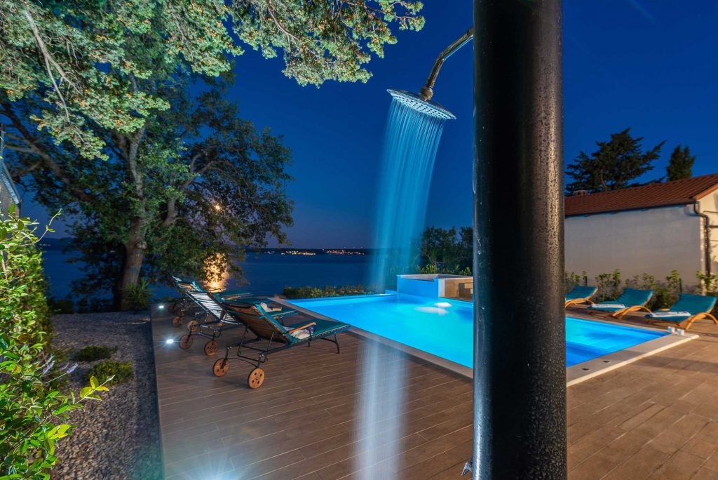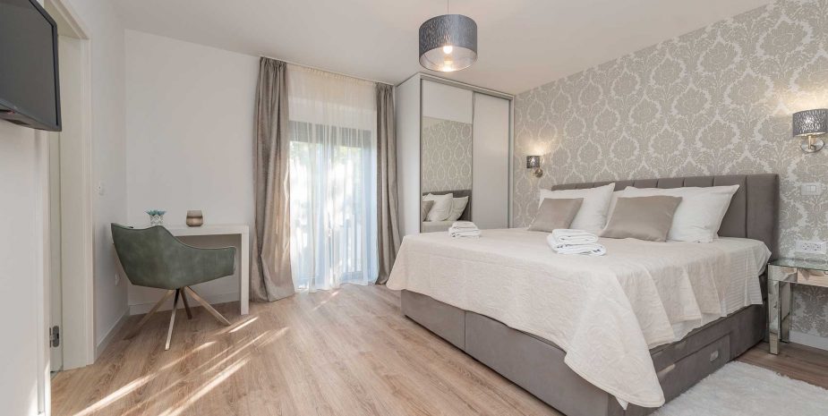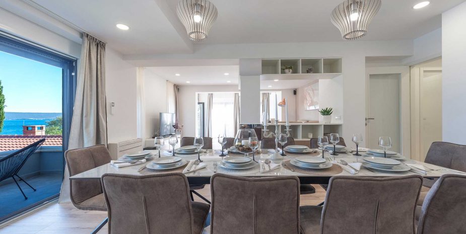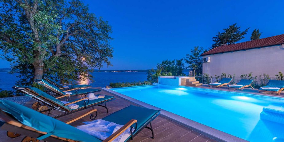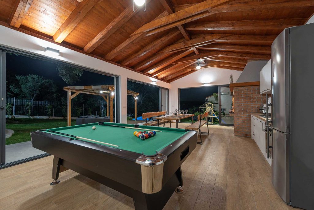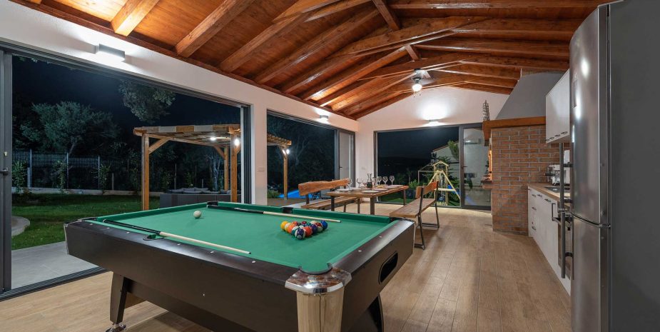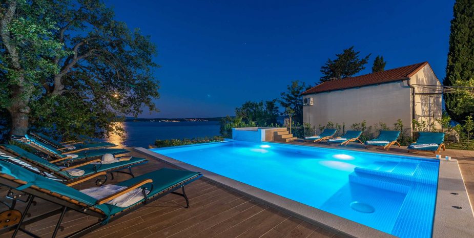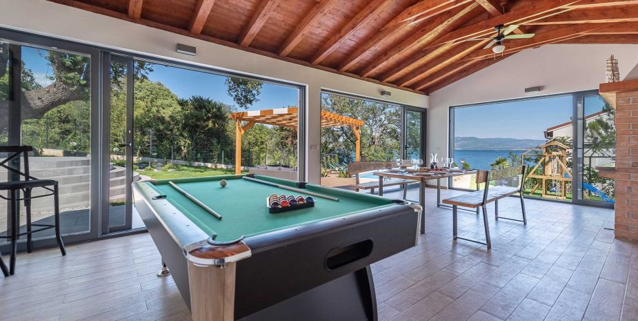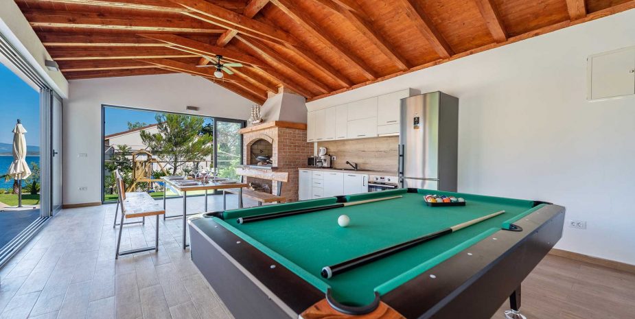 Auf der ersten Etage gibt es ein Wohnzimmer, eine Küche und zwei Schlafzimmern. Von einem geräumigen und komfortablen Wohnzimmer aus können Sie dank der offenen Raumgestaltung leicht in das Esszimmer gehen. Eine gut geplante und ausgestattete Küche befindet sich neben dem Balkon mit Blick auf die türkisfarbene Adria. In diesem luftigen und hellen Raum werden mediterrane Gerichte für Familie und Freunde schnell zubereitet, während ihr in ihren bequemen Stühlen plaudern. Jedes der Schlafzimmer ist mit Doppelbetten und eigenem Bad ausgestattet. In der zweiten Etage befinden sich die drei verbleibenden Schlafzimmer mit en-suite Badezimmern. Alles in allem können Sie wählen, ob Sie sich in einem der drei Queen-Size-Betten oder zwei Kingsize-Betten schlafen möchten. PlayStation4, Darts und Billard sollten bei der Beschreibung von Unterhaltungsinhalten erwähnt werden.