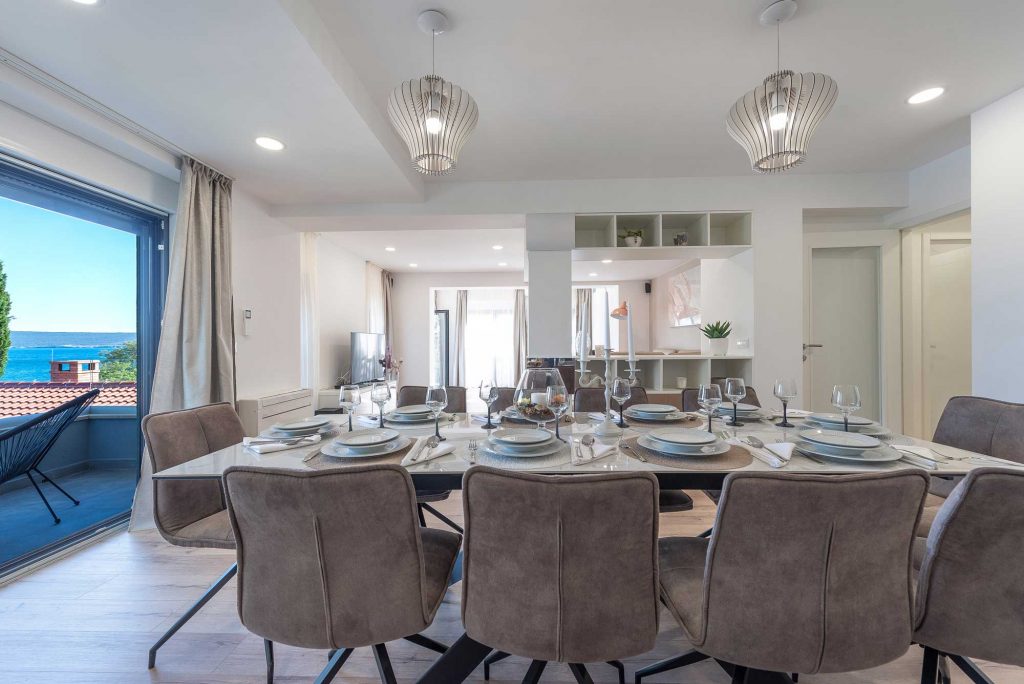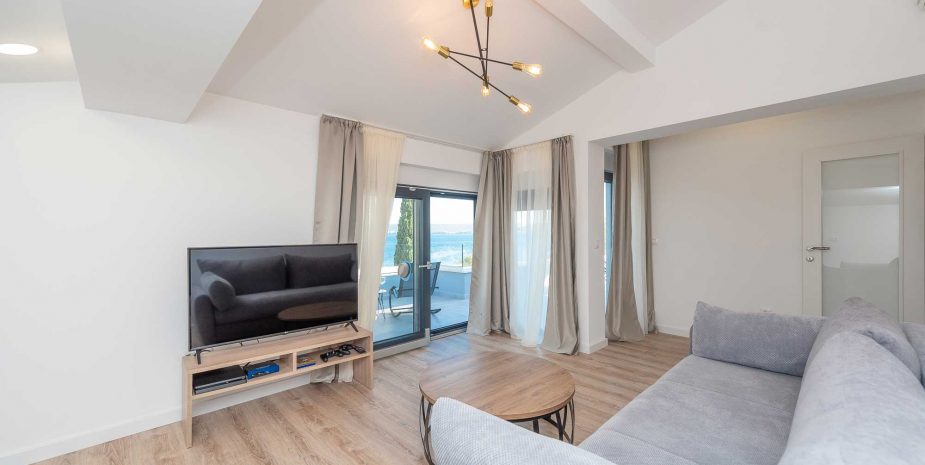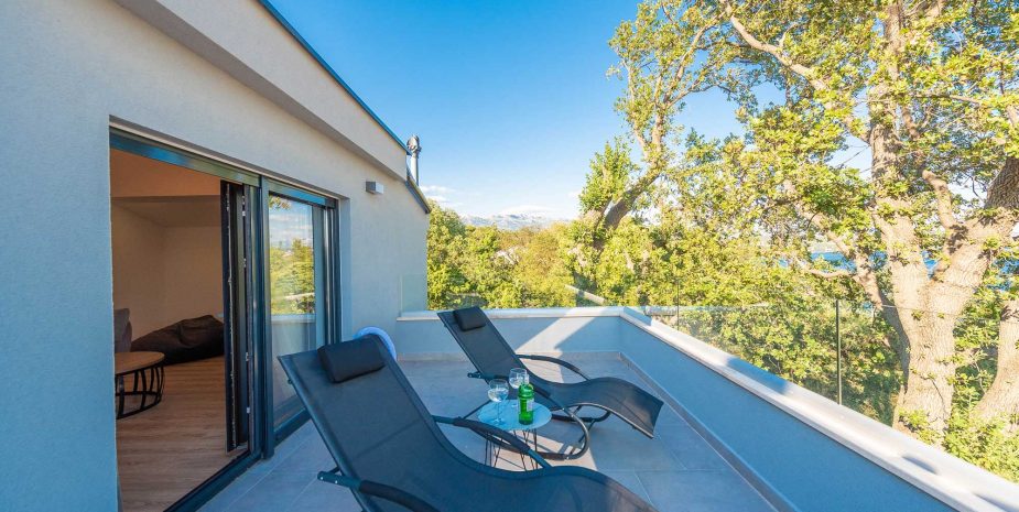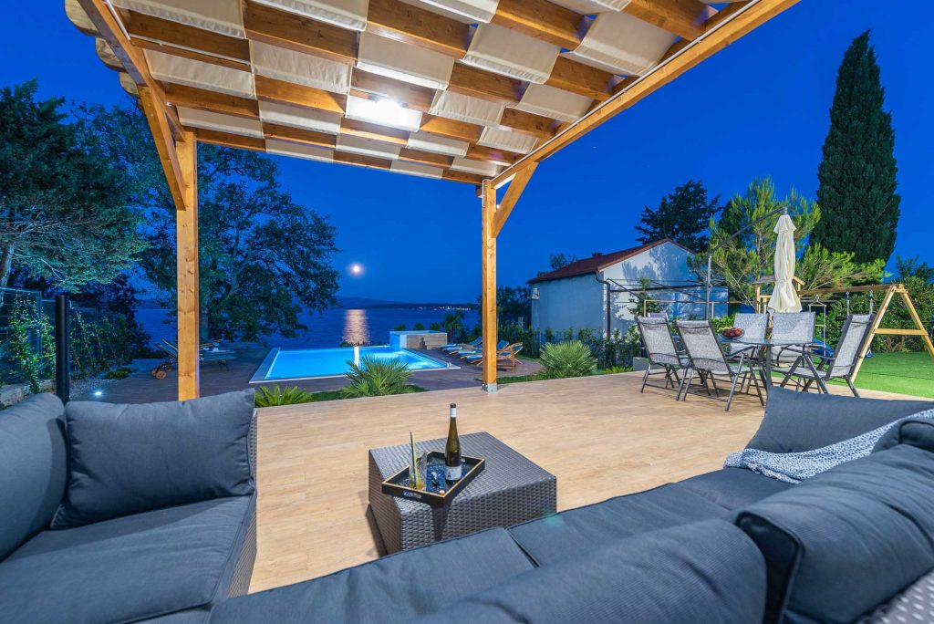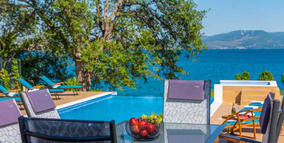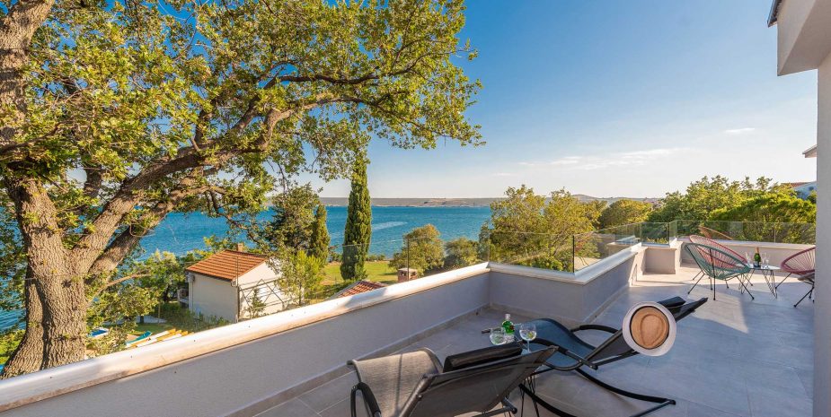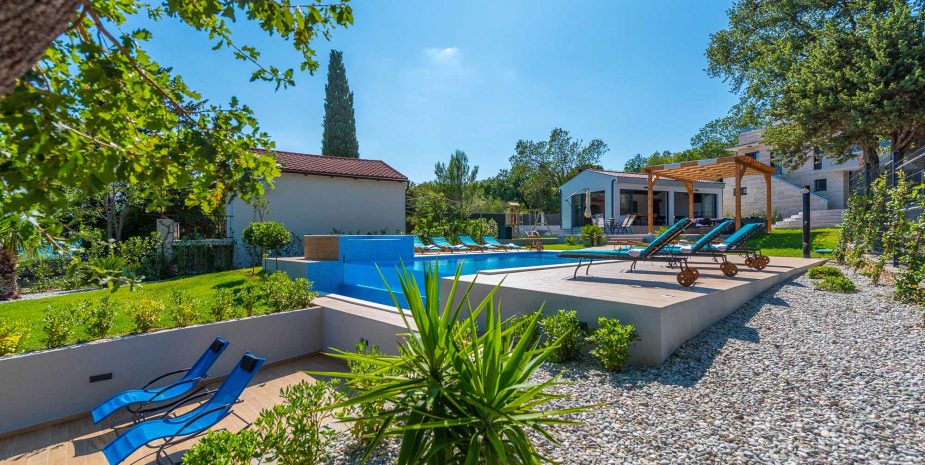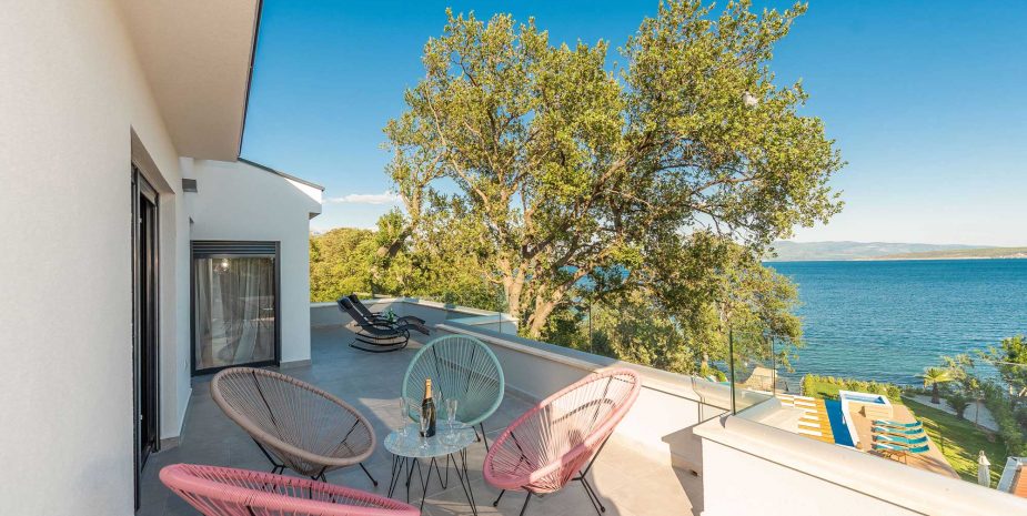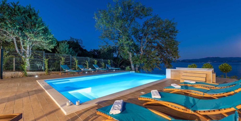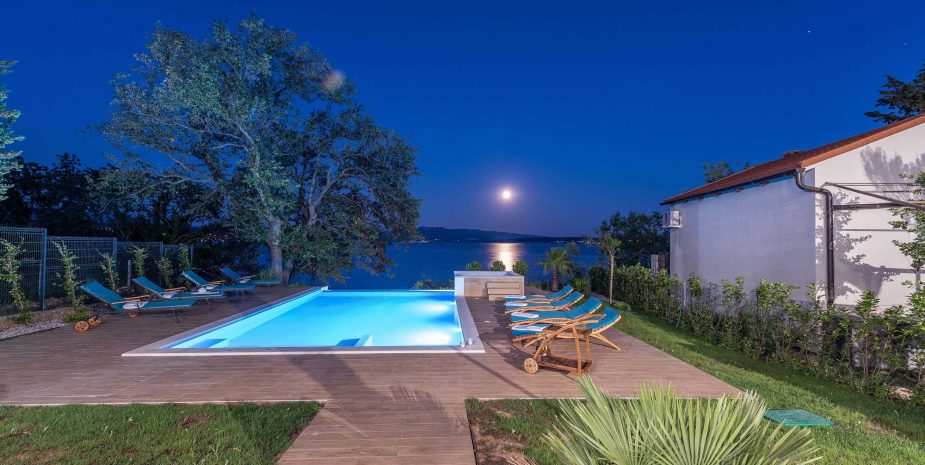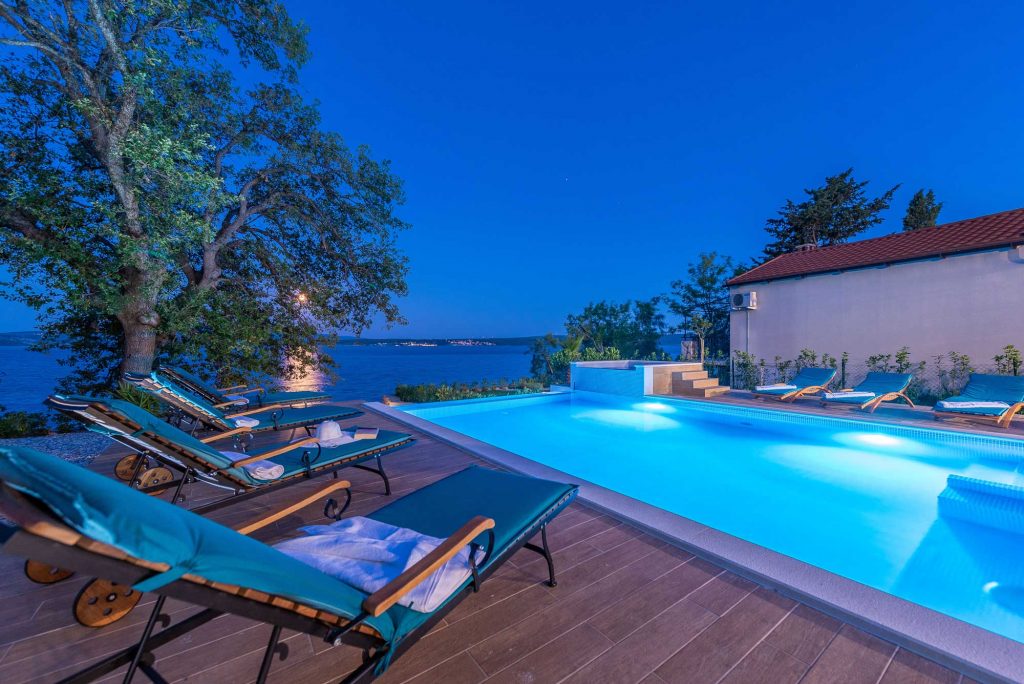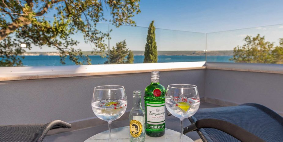 Auf der ersten Etage gibt es ein Wohnzimmer, eine Küche und zwei Schlafzimmern. Von einem geräumigen und komfortablen Wohnzimmer aus können Sie dank der offenen Raumgestaltung leicht in das Esszimmer gehen. Eine gut geplante und ausgestattete Küche befindet sich neben dem Balkon mit Blick auf die türkisfarbene Adria. In diesem luftigen und hellen Raum werden mediterrane Gerichte für Familie und Freunde schnell zubereitet, während ihr in ihren bequemen Stühlen plaudern. Jedes der Schlafzimmer ist mit Doppelbetten und eigenem Bad ausgestattet. In der zweiten Etage befinden sich die drei verbleibenden Schlafzimmer mit en-suite Badezimmern. Alles in allem können Sie wählen, ob Sie sich in einem der drei Queen-Size-Betten oder zwei Kingsize-Betten schlafen möchten. PlayStation4, Darts und Billard sollten bei der Beschreibung von Unterhaltungsinhalten erwähnt werden.